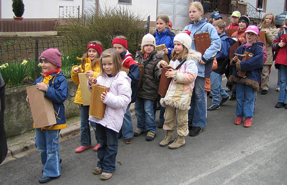 Nach altem Brauch schweigt das Glockengeläut der Kirche von Gründonnerstag bis zur Osternacht. Ihre Aufgabe übernehmen die Klapperkinder. Sie treffen sich in der Bergstraße und ziehen durch alle Straßen des Dorfes.
